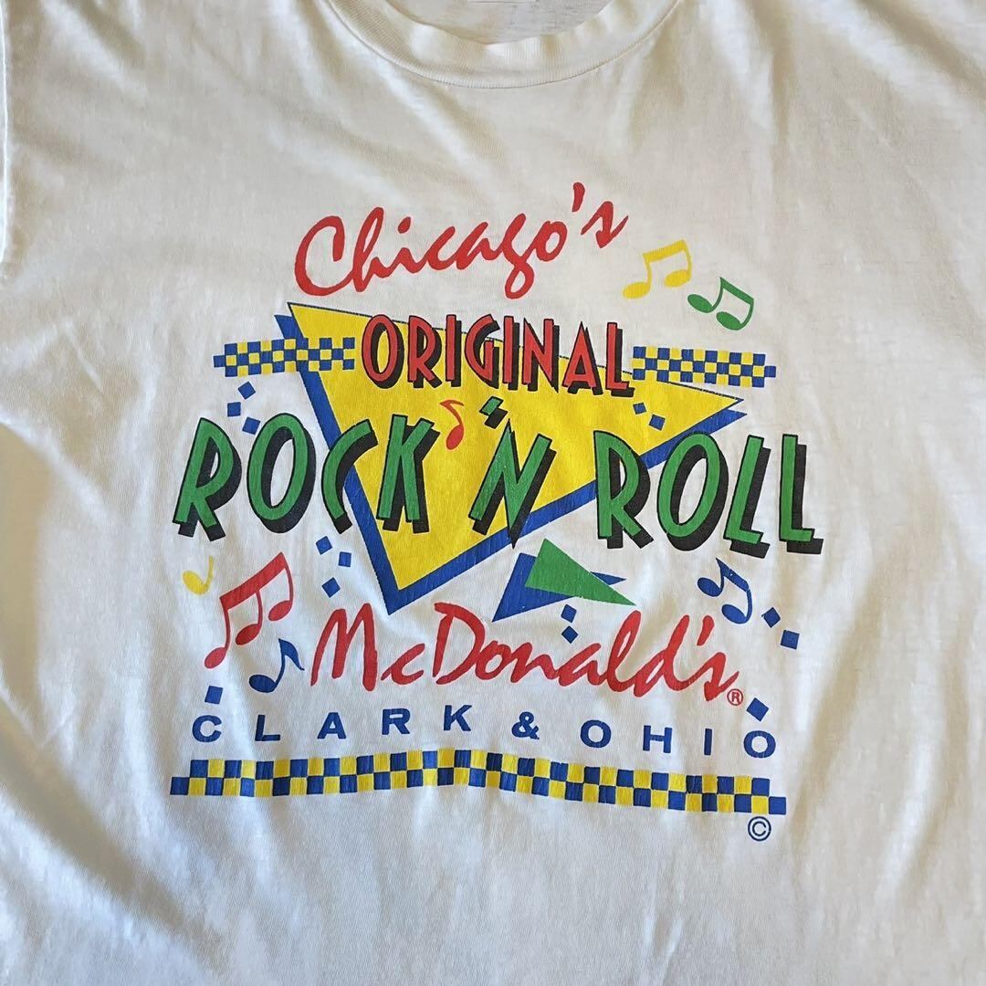 80年代アローレボディのビンテージプリントTシャツです。おそらくマクドナルドのノベルティTかと思います。ロックンロール、チェッカー柄、オハイオなど80sらしいタッチでデザインされたアメリカ古着ばっちりのアイテムです。