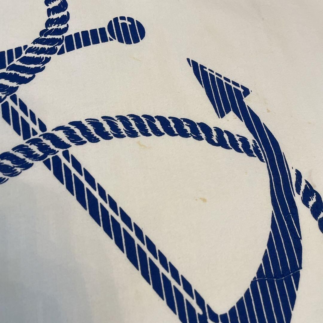 USA製ビンテージリブTシャツです。襟がリブ、袖がシングルステッチ、後ろの裾が長めになったドロップテールのシルエットです。レトロなアンカーがプリントされたデザインです。