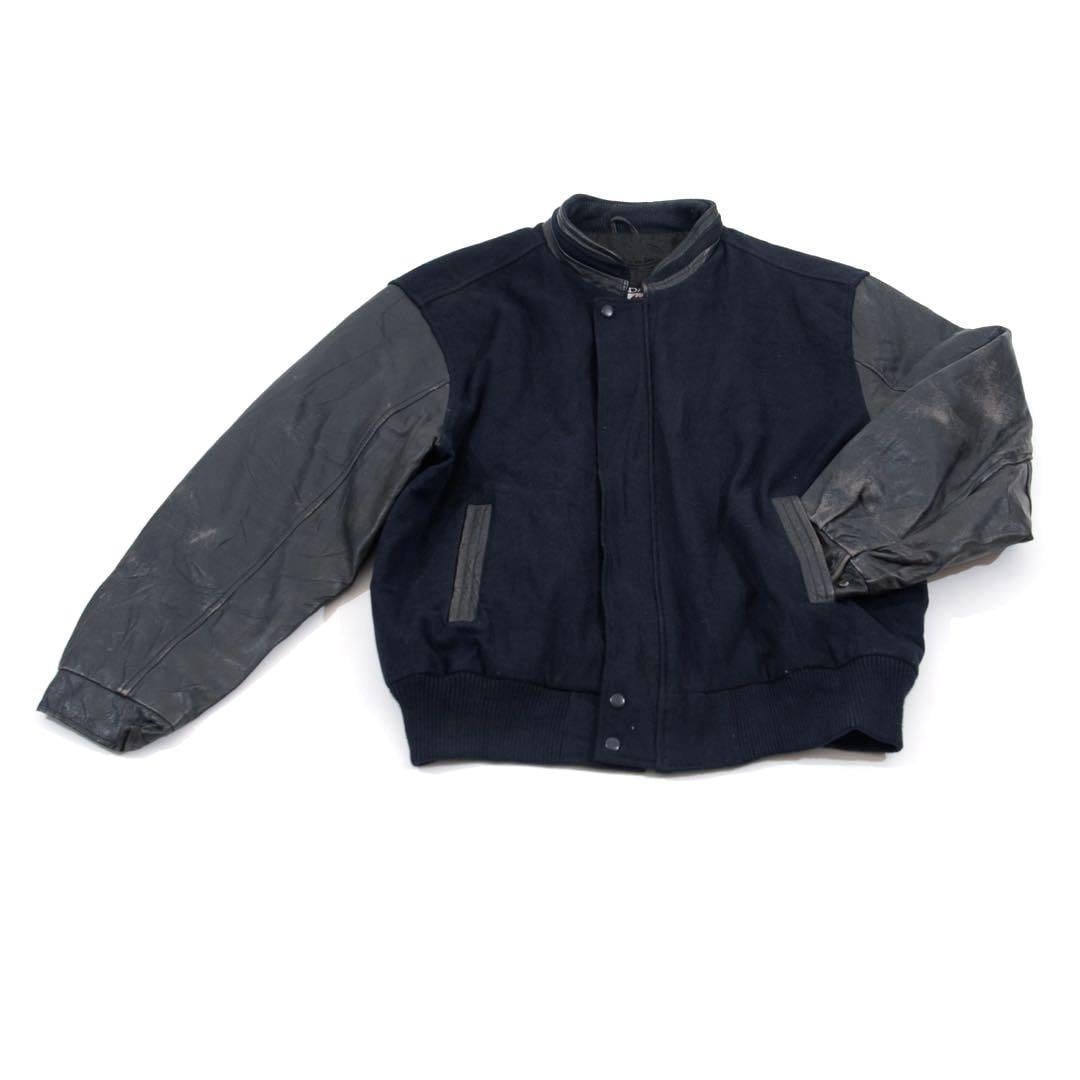 80s スタジャン ウール 袖 レザー 刺繍 スタンドカラー ジップアップ 80年代 カークラブ ジャケット ホッドロッド レトロカー 黒 古着 【XL】