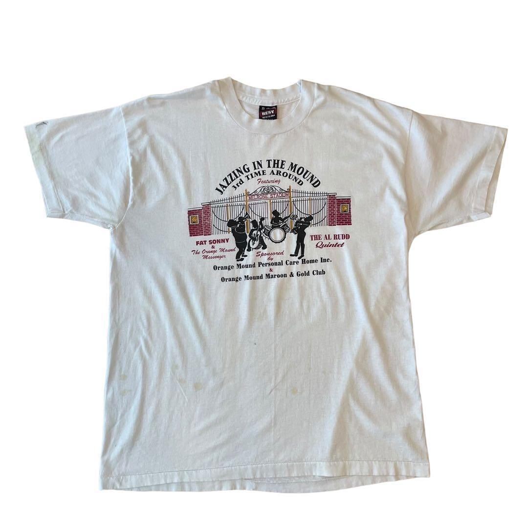 90s Fruit of the loom フルーツオブザルーム ビンテージ プリント Tシャツ USA製 シングルステッチ 音楽 ジャズ イベント 楽器 ミュージシャン バンド メルローズ カリフォルニア ボックスシルエット 白 古着 【XL】