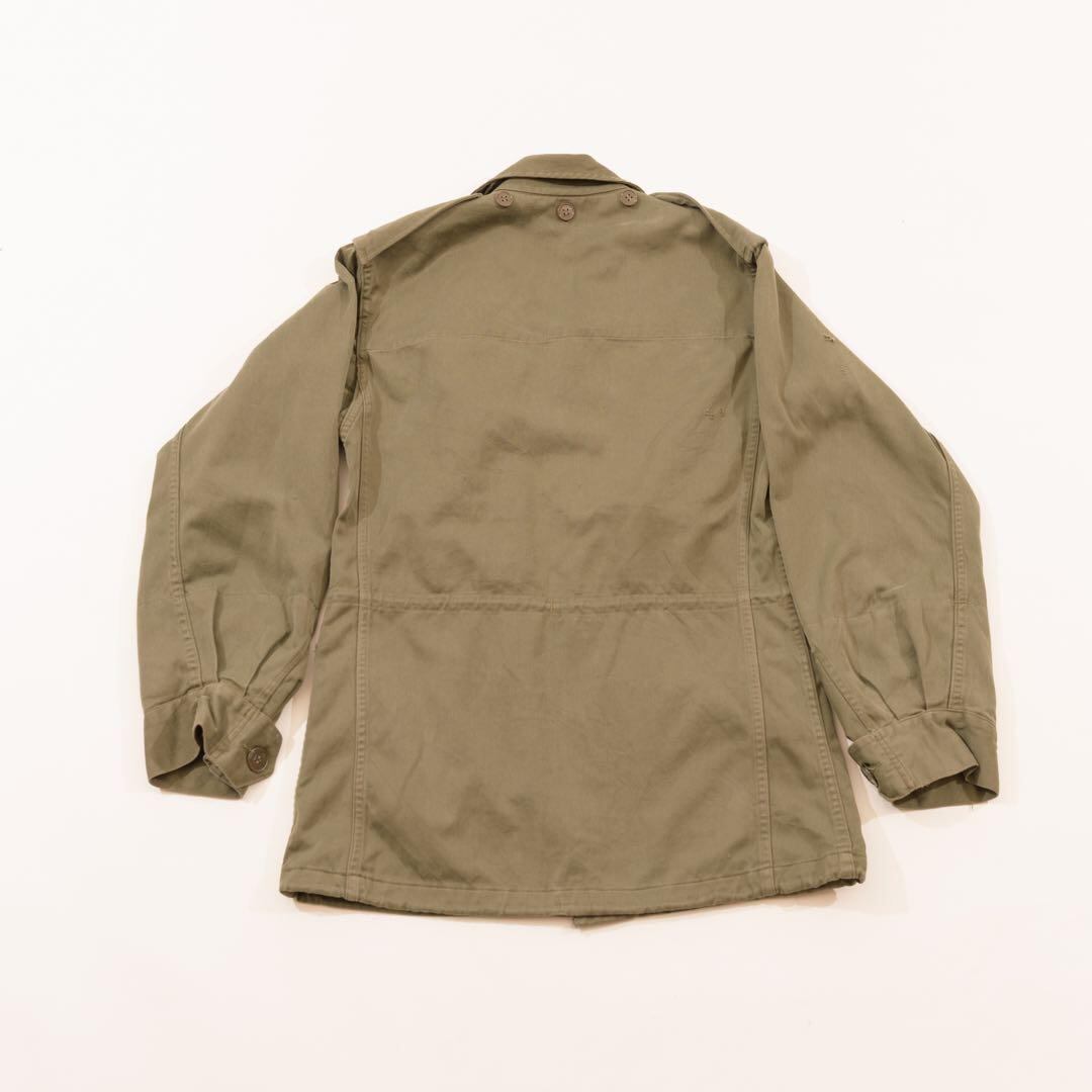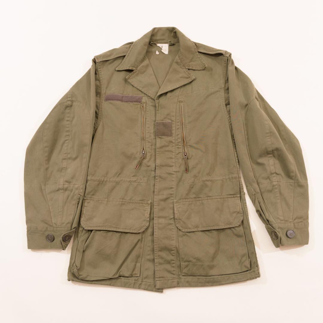 80s フランス軍 実物 M64 フィールド ジャケット 81年 ガスフラップ チンストラップ エポレット ミドル丈 カバーオール ミリタリージャケット サテン 薄手 ライトアウター オリーブ 緑 vintage 古着