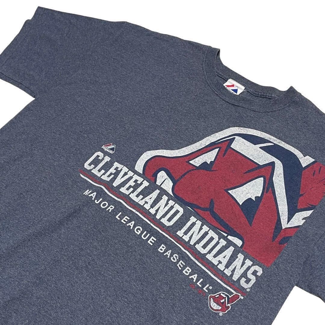 00s Majestic MLB チームロゴ プリント Tシャツ クリーブランドインディアンズ ボックスシルエット オーバーサイズ 野球 マジェスティック 灰色 vintage 古着 【XL】