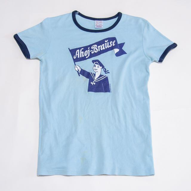 キャラクター プリント リンガー Tシャツ アドバタイジング Tシャツ アメリカ フレーバージュース お菓子 水兵 細身 水色 vintage 古着 【M】